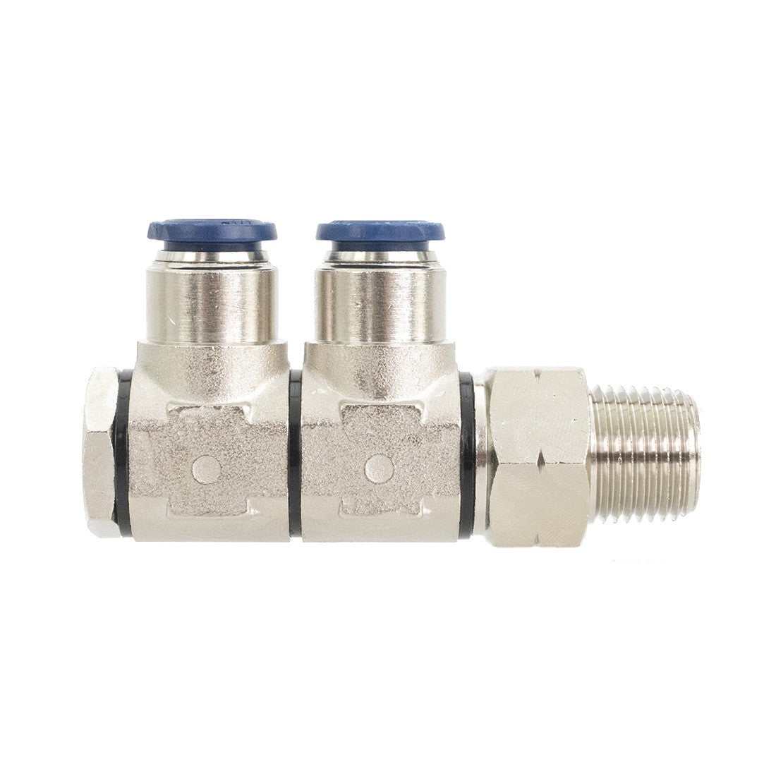 This Pure Water Power Double Banjo is one of many replacement parts we offer for your water purification systems. Made from durable materials, this double banjo has a 1/2-inch NPT stem that features two single 1/2-inch nickel-coated brass push-to-fit outlets/banjo bodies.