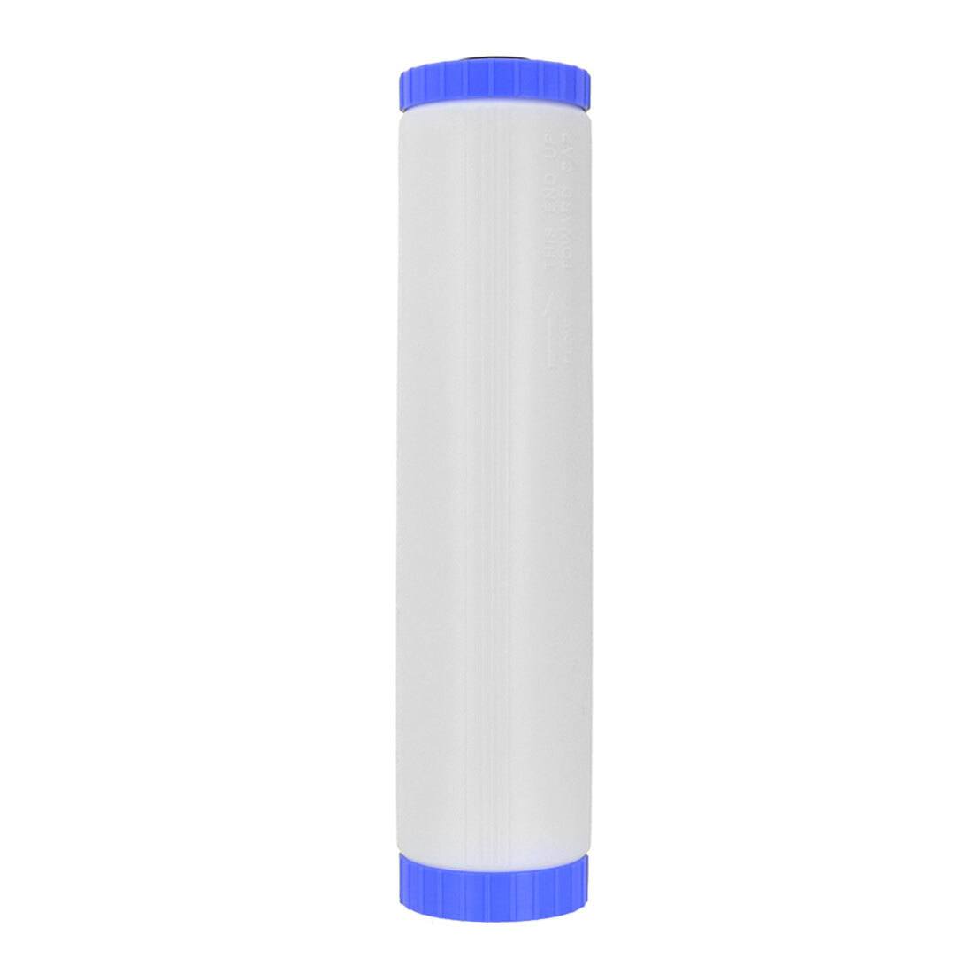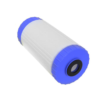 The 10-inch refillable cartridge is designed to hold just under 1/8 of a cubic foot of DI resin, while the 20-inch option holds 1/4 of a cubic foot.