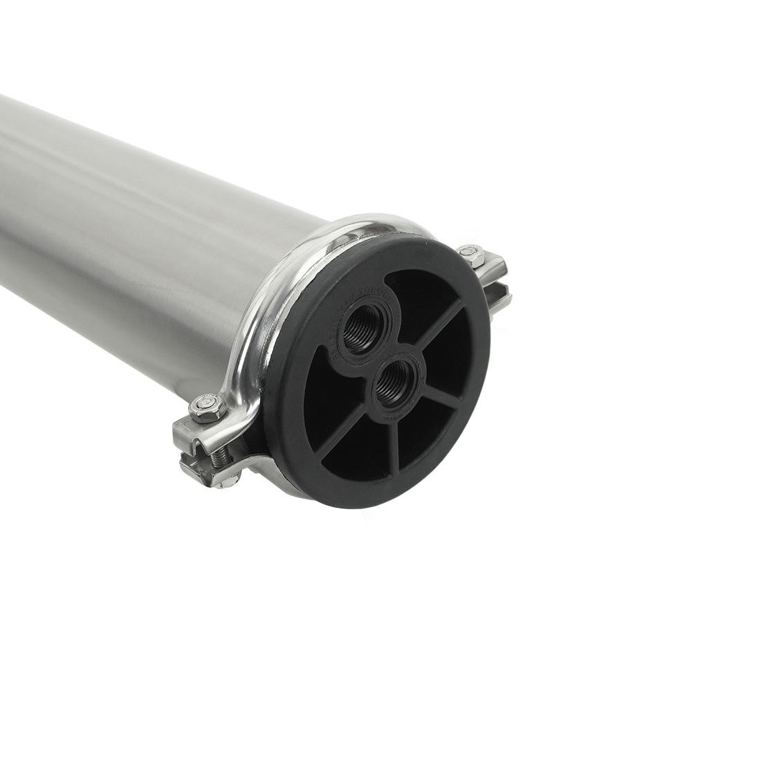 This Pure Water Power RO Housing stores and protects the RO Membrane on your PWP Little Beast, Solar Beast, Double RO/DI, and Single RO/DI water purification systems. Should your system's RO Membrane housing become damaged, this unit offers a reliable replacement option. Crafted from resilient stainless steel, it accommodates 40" membranes with ease. Complete with end caps and clamps to secure them in place, this housing unit ensures the integrity of your system.